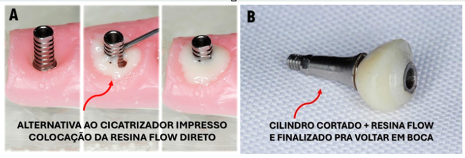 Figura 2 – Em A, observamos a sequência de individualização do pilar provisório com resina flow. Em B, temos o conjunto pilar provisório já cortado e com a resina flow devidamente ajustada ao arcabouço alveolar.