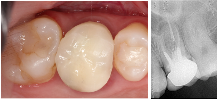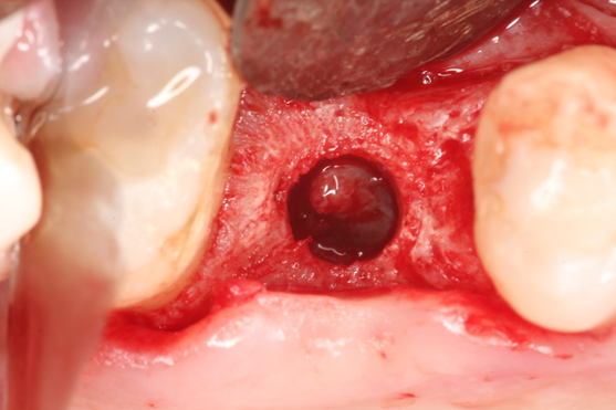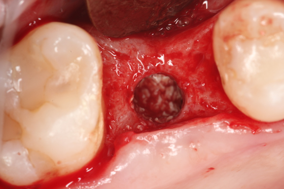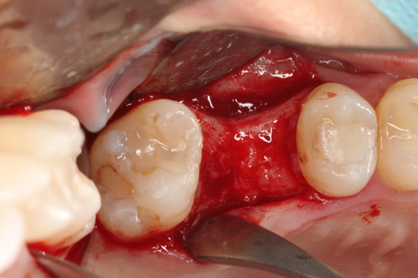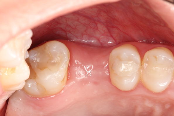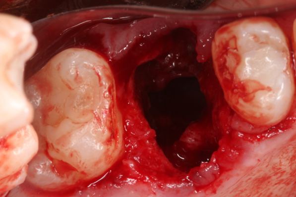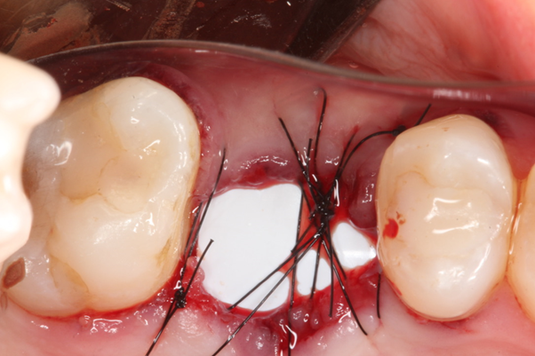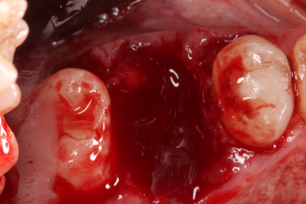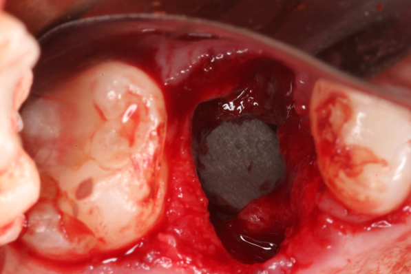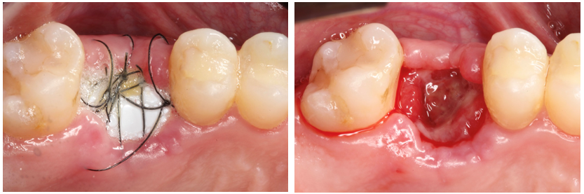 Paciente C.B.F.J., 33 anos, leucoderma, não-fumante e em boas condições de saúde sistêmica, relatou sensibilidade dolorosa durante mastigação no elemento 26, que já possuía tratamento endodôntico, pinos metálicos intrarradiculares e coroa metalocerâmica (Figura 1). Foi solicitada tomografia computadorizada de feixe cônico, na qual a imagem sugeriu fratura radicular na região da furca, descontinuidade óssea da cortical de seio maxilar e opacificação parcial do seio maxilar esquerdo (Figura 2). Foi realizada a exodontia e pôde-se confirmar a comunicação oroantral (Figura 3). Após curetagem do alvéolo, sem preocupação em curetar e remover a lesão cística sinusal, uma barreira reabsorvível foi recortada e posicionada no fundo do alvéolo para obliterar a descontinuidade óssea e impedir que células de tecido mole oriundas da cavidade sinusal invadissem a região alveolar (Figura 4). O alvéolo foi preenchido totalmente por coágulo sanguíneo do paciente (Figura 5) e o alvéolo foi selado por uma barreira não-reabsorvível (Figura 6), impedindo a invasão de fibroblastos do tecido gengival para dentro do alvéolo. Após duas semanas, a barreira estava estável e, então, foi removida, desnudando um tecido de granulação osteoblastogênico (Figura 7).