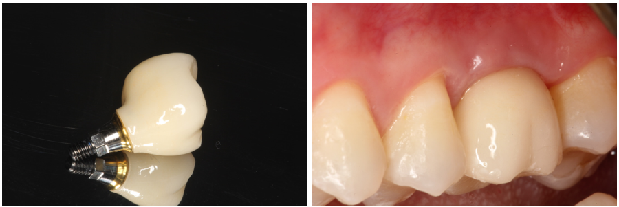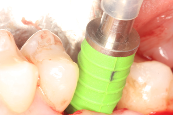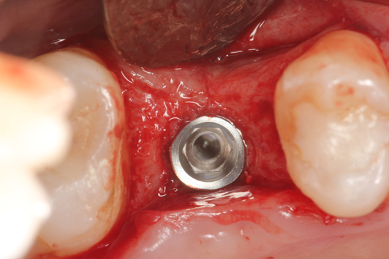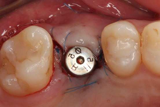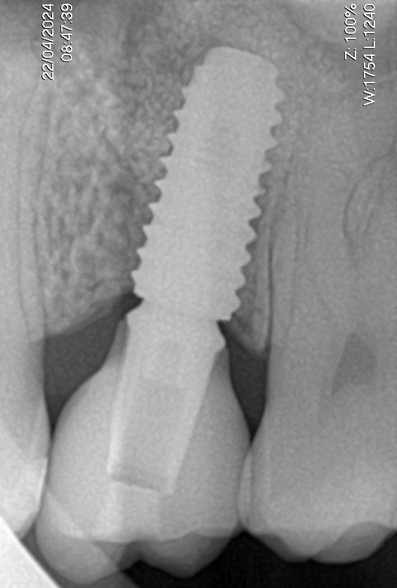 Enfim, um implante osseointegrável de 5.0 x 10 mm TS III (Osstem, Seul, República da Coréia) foi instalado (Figura 14). Após três meses foi feita a reabertura com enxerto de tecido conjuntivo do palato na vestibular e instalação de um cicatrizador (Figura 15). Um mês depois, um provisório foi instalado para promover o correto perfil de emergência gengival (Figura 16) e, então, foi utilizado um corpo de escaneamento (Osstem, Seul, República da Coréia), conforme Figura 16, para a realização do escaneamento para a moldagem digital. Uma coroa em dissilicato de lítio sobre pilar de titânio “Rigid” (Osstem, Seul, República da Coréia) foi confeccionada e parafusada sobre o implante com torque de 30 Ncm (Figura 17). Uma radiografia periapical final sugere a osseointegração do implante, a estabilidade do enxerto ósseo na região do seio maxilar e a perfeita adaptação protética após 12 meses (Figura 18).
